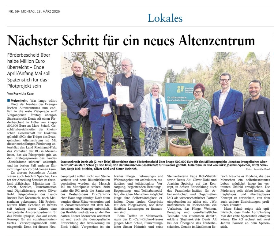 Am Freitag, 13. März 2026, überreichte Staatssekretär Denis Alt der Rheinischen Gesellschaft für Diakonie gGmbH den Zuwendungsbescheid zur Projektförderung für die Projektentwicklung eines sozialraumorientierten Versorgungs- und Quartierskonzeptes im Zusammenhang mit dem Neubau des Ev. Altenzentrums „Dr.-Carl-Kircher-Haus“ in Meisenheim. Herr Martin Schué, Geschäftsbereichsleitung für den Bereich Altenhilfe, nahm den Bescheid entgegen.